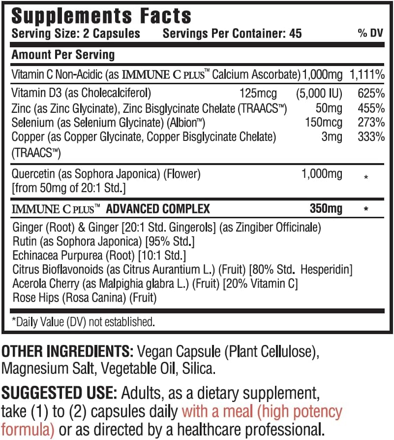 (90 Capsules), Quercetin 1,000mg, Vitamin C 1,000mg, Zinc 50mg, Vitamin D3 5,000iu, Selenium, Copper, Acerola, Ginger, Rutin, Bitter Orange, Rose Hips, Echinacea, Immune C Plus, 12 in 1 Immune Support