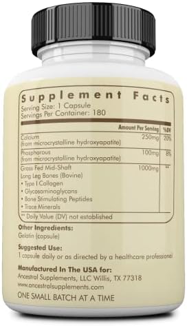 About this item Time-Honored Bone Supplements: Grounded in the traditional wisdom of ancient practices, this living bone beef organ supplement is rich in bioavailable calcium and phosphorus at an ideal 2:1 physiological ratio that promotes bone strength Powerful Joint Supplement: These organ supplements contain Type I bovine collagen and provide targeted support for joint health and flexibility Remineralization Support: Designed to promote bone and oral health, our calcium and phosphorus supplements feature a microcrystalline structure with bone-stimulating peptides to enhance absorption and support remineralization New Zealand and Australia Grass Fed Beef: Made in small batches in the USA without GMOs, fillers, or flow agents and third party tested for purity, our supplements are sourced from 100% grass fed cows, pasture-raised without hormones in green fields Dense Nutrition for Bone and Joint Health: As the founders of the Beef Organ Movement, our mission is to make vital nutrition through the highest possible quality organ consumption accessible for all, putting back in what the modern world has left out