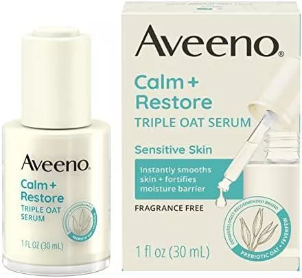 Aveeno Calm + Restore Triple Oat Hydrating Face Serum is specially designed for sensitive, dry, and irritated skin. This lightweight, fast-absorbing formula instantly hydrates and helps smooth skin with just one use, while strengthening the skin’s natural moisture barrier over time.