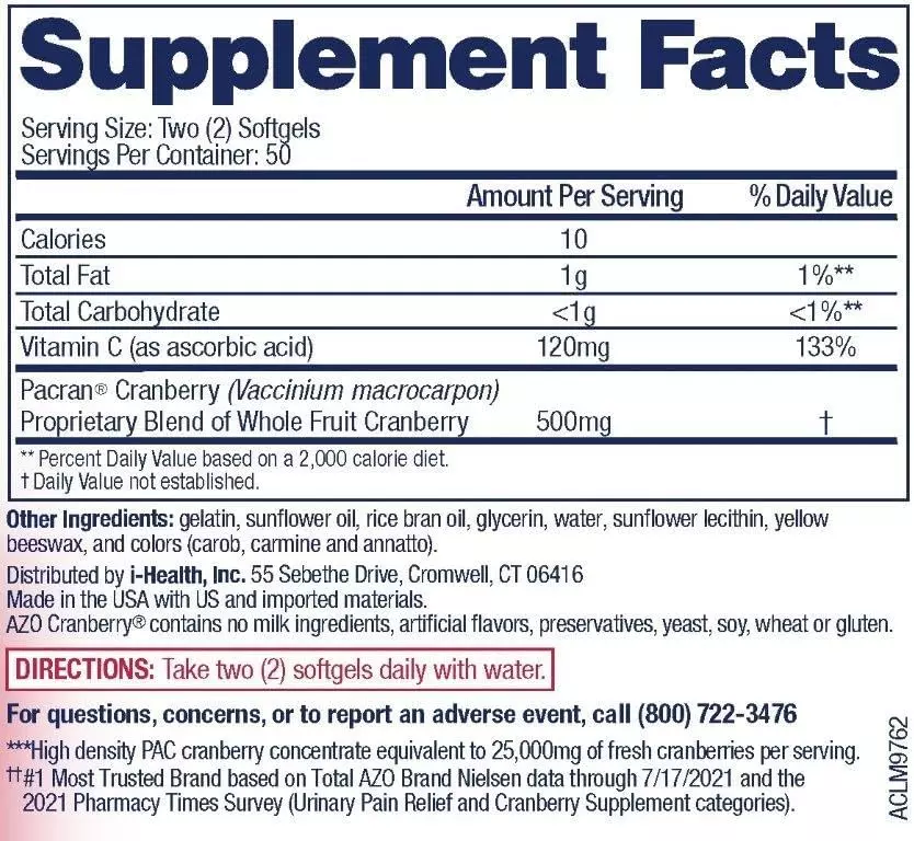 About this item AZO CRANBERRY PILLS URINARY TRACT HEALTH SUPPLEMENT – Taking these softgels can help maintain a healthy urinary tract for men & women NATURALLY SOURCED INGREDIENTS – These cranberry softgels are made with Pacran, a super-concentrated whole fruit cranberry blend which helps flush the urinary tract SUGAR FREE & GLUTEN FREE – Each serving is equal to the benefits of one glass of cranberry juice; many cranberry juice cocktails have over 42 grams of sugar & 165 calories per 12 ounce serving while AZO cranberry softgels are sugar & gluten free HOW TO TAKE – Take two softgels daily with water; 100 softgels per bottle (50 day supply) CONVENIENT, EASY TO SWALLOW SOFTGELS – Try AZO Cranberry Softgels as a convenient way to maintain your healthy urinary tract without extra sugar or calories found in cranberry juice