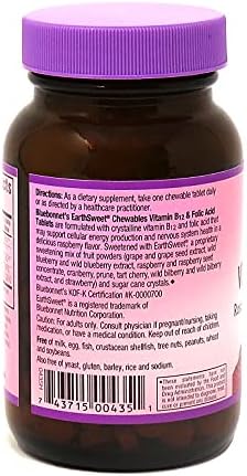 Bluebonnet’s EarthSweet Chewables Vitamin B12 & Folic Acid Tablets contain 1000 mcg of pure crystalline vitamin B12 and 400 mcg of folic acid in a natural raspberry flavor. Sweetened with EarthSweet, a sweetening mix of juice concentrates (wild blueberry, cranberry, strawberry, grape, raspberry, and bilberry fruits, grape seed and raspberry seed extracts) and cane crystals. Available in chewable tablets for maximum assimilation and absorption.