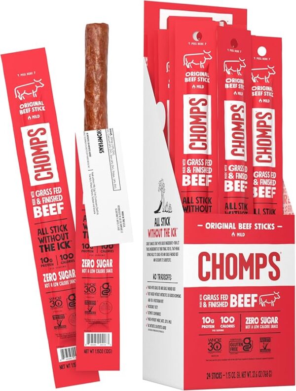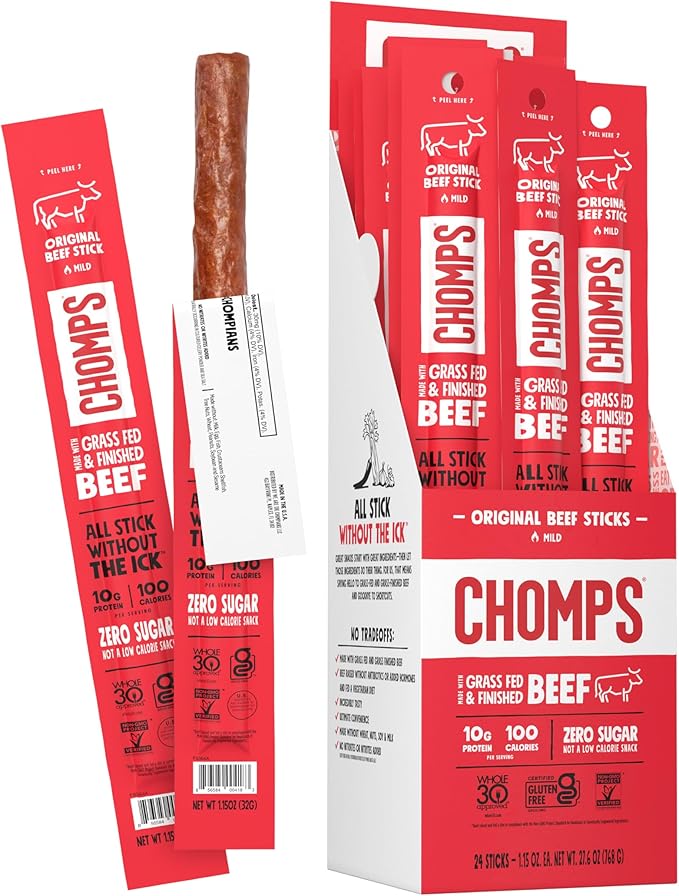 CHOMPS Grass-Fed Original Beef Jerky Snack Sticks are a clean, protein-packed snack made from 100% grass-fed and grass-finished beef. Each convenient stick delivers 9g of protein with only 90 calories, making it an excellent option for those following low-carb, high-protein, or paleo-friendly lifestyles.