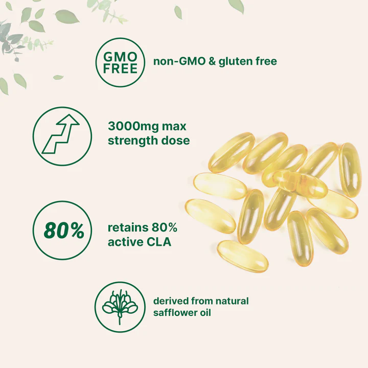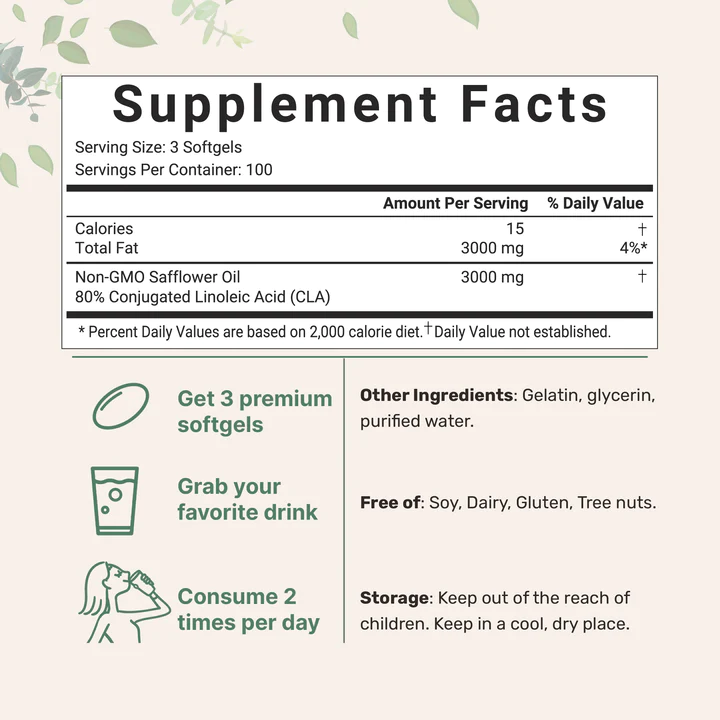 • CLA Capsules (Liquid Soft-gel ), Made with 80% CLA from Safflower Oil, 3000mg Per Serving, 300 Counts, No GMOs.