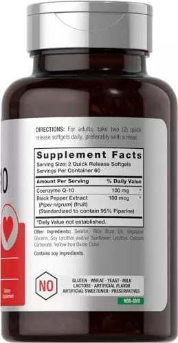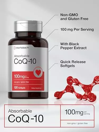 About this item POWERFUL ANTIOXIDANT: CoQ-10 is a naturally occurring compound found throughout the body ABSORBABLE FORMULA: 100 mg of CoQ-10 plus 100 mcg of Black Pepper Extract per serving EXPERTLY CRAFTED: Our professional formula is backed by our commitment to purity and potency HORBAACH MANUFACTURERS: Laboratory Tested, Trusted Ingredients, Superior Quality, 100% Guaranteed! NATURALLY FREE OF: Gluten, Wheat, Yeast, Milk, Lactose, Artificial Flavor, Preservatives & Non-GMO
