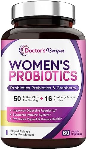 About this item Powerful Digestive & Immune Supplement*: Our daily probiotic for women, containing 50 billion CFUs from 16 clinically proven strains, helps support digestive and immune health*. Vaginal & Urinary Boost For Feminine Health*: Our industry leading probiotics with specially selected Lactobacillus rhamnosus and Lactobacillus reuteri may help boost a healthier vaginal flora and urinary tract*. Carefully Formulated With Prebiotics & Cranberries: Prebiotics provide necessary nutrition for probiotics to thrive. Probiotics and prebiotics work together to deliver digestive health benefits*. This carefully formulated blend is also enforced with organic cranberry extract to help maintain vaginal health and relieve urinary tract infections*. Delayed Release & Shelf Stable: The delayed release delivery allows probiotics to remain intact in stomach acid and reach your intestinal tract alive for optimized potency. Doctor’s Recipes Women Probiotics is shelf stable and is your best choice at home or on the go. Proudly Made In The USA: Our advanced strength formula is loaded with the highest grade & naturally sourced ingredients in an FDA inspected and GMP certified facility in the USA. Doctor’s Recipes Women Probiotics is 100% pure, natural, vegan friendly & NON-GMO with no soy, gluten and dairy.