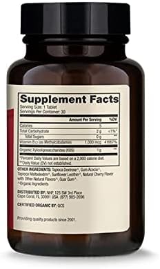 About this item Each Organic Chewable Vitamin B12 Contains 30 Servings (30 Tablets) per Bottle Following Dr. Mercola’s belief in providing the best quality products, this product is non-GMO, Gluten Free, Soy Free, and USDA Organic Taking vitamin B12 supplementation to a whole new level, our Chewable Vitamin B12 also provides 1 gram per serving of a special organic prebiotic that helps your body make its own supply of B12 called Xylooligosaccharides, or XOS. XOS is gaining recognition for its ability to promote the growth of healthy Lactobacillus and Bifidobacteria in your colon and replenish age-related gut bacteria loss, promoting regularity, and supporting already healthy lipid levels.* All Dr. Mercola products are backed by a full 30-day money-back guarantee. If for any reason you are not satisfied with your purchase, simply return it to us for your money back