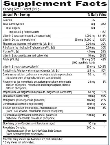 About this item Emergen-C Elderberry fizzy drink mix provides daily immune system support with the natural goodness of botanicals Crafted with elderberry and other natural fruit flavors, this vegetarian, gluten-free and caffeine-free elderberry drink powder is the perfect fit for holistic wellness Everyday immune support with high potency Vitamin C This elderberry instant drink mix also support your immunity with antioxidants Zinc and Manganese, and B vitamins to naturally enhance your energy Experience the power of Emergen-C and the goodness of botanicals with the great tasting Emergen-C Elderberry fizzy drink mix, which makes immune support simple, even on the go