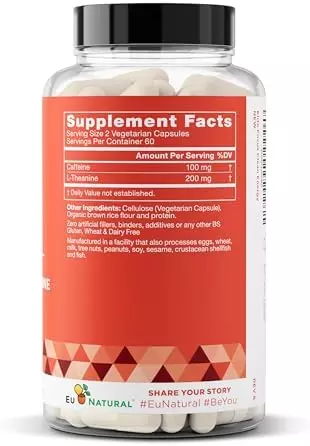 SMOOTH FOCUSED ENERGY Caffeine & L-Theanine nootropic stack, clinically researched to provide clean energy and lasting endurance. 100mg Caffeine + 200mg L-Theanine. NO JITTERS OR CRASH Supports studying, fitness, and your daily work, without the negative effects of regular caffeine. An easy replacement for sugary coffee and energy drinks. 99.8%+ PURITY Each serving is formulated with pure Caffeine and L-Theanine at full researched dose. You can have the confidence that every caffeine l theanine capsule has the strength and potency that you are looking for in a product. LAB CERTIFIED PURITY We blend all our products at a cGMP Certified Laboratory to ensure strict standards and contaminant-free energy supplements. We wouldn’t have it any other way and neither should you. SUPER INGREDIENTS No jitters or crash to power you through your workouts and activities. As researched, each two capsule serving provides full dose of 100 mg of Caffeine and 200 mg of L-Theanine.