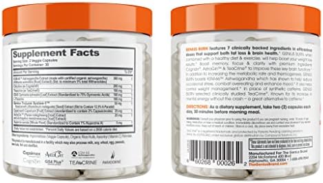 Genius Burn – Caffeine-Free Thermogenic Fat Burner & Nootropic – 60 Vegan Capsules with Ashwagandha & TeaCrine