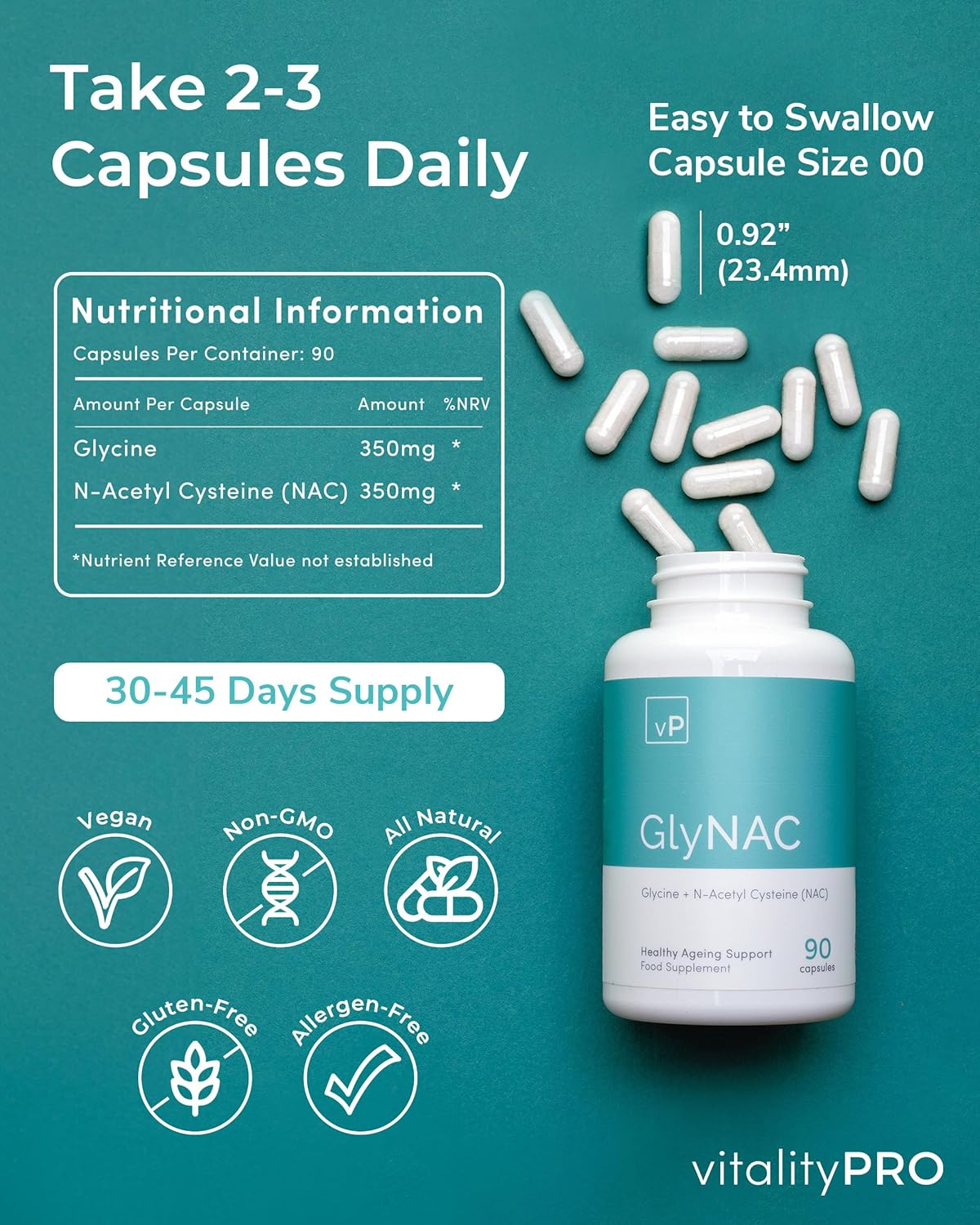 Recommended Dosage: Take 2-3 GlyNAC antioxidant capsules daily with water, before or after meals. Each bottle contains 90 capsules (700mg each), offering a 30-45 day supply. Suitable for adults only.