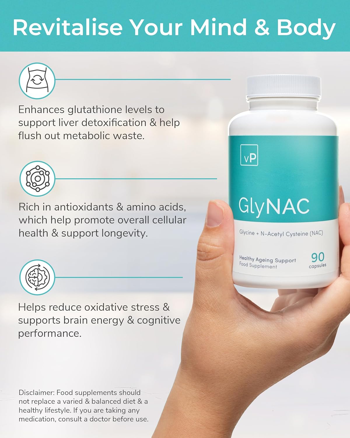 Enhance Your Overall Well-being: Our GlyNAC supplements combine 350mg of Glycine powder and 350mg of N-Acetyl Cysteine, packed with amino acids and antioxidants. These ingredients support metabolism, improve heart and brain health, and encourage longevity and natural detoxification.