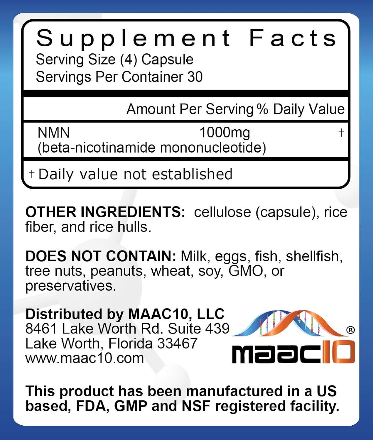 - NMN Supplements 1000mg Serving – Choose Authentic NMN – A recent third-party test showed MAAC10 had the highest NMN content (10mg per capsule over the label claim) of all brands tested on the platform. 64% percent of the products tested had little or no NMN. The market is flooded with pseudo-NMN products. Get what you pay for, don’t get bamboozled.