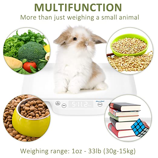MomMed Digital Pet Scale, Portable Pet Dog Cat Scale with Hold and Tare Function, Precision Digital Scale, New Born Puppy and Kitten Scale with Tray for Puppy/Hamster/Little Bird/Rabbit, 1oz – 33lb