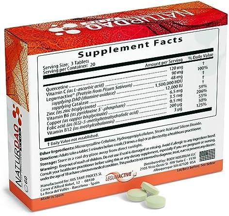 About this item ✔ Most powerful DAO supplement | Naturdao Plus is a high-potency DAO supplement that provides your body with the enzymes it needs to break down histamine. It is also formulated with cofactors and adjuvants that help to optimize the absorption and effectiveness of DAO. ✔ Naturdao Plus offers the perfect combination of science, innovation and a premium LegumActive formula. It is cruelty-free, gluten-free, GMO-free, and 100% vegan. ✔ Maximum bioavailability | Naturdao Plus is formulated to maximize the absorption of all of its ingredients. This is done by activating the ingredients through methylation, phytosomization, and liposomization. ✔ Essential Activated Ingredients | CO-FACTORS: Liposomal Ascorbic Acid, Zinc, Methylated Pyridoxal-5-Phosphate and Copper. ADJUVANTS: Phytosome Quercetin, Methylated 5-Methyltetrahydrofolate, Methylcobalamin and Catalase. ✔ Satisfaction guarantee | Naturdao Plus is backed by a satisfaction guarantee. If you are not satisfied with the results, contact us directly through your order menu for a full refund (no return needed).