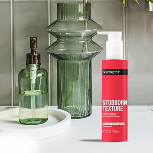About this item 6.3-fluid ounces of Neutrogena Stubborn Texture Acne Facial Cleanser Gel with salicylic acid to help clear skin and visibly smooth uneven texture This daily oil-free and fragrance-free face wash features 1% salicylic acid (BHA) acne medication to eliminate stubborn acne breakouts and helps prevent new acne from forming The dermatologist-grade acid complex also contains 2% glycolic acid (AHA) to help loosen and shed excess dead surface skin and 2% polyhydroxy acid (PHA) for targeted exfoliation to clear and smooth skin From a dermatologist-recommended brand, this exfoliating gel face wash is free from fragrances, parabens, oil, phthalates, dyes, and sulfates and makes a great addition to an acne-prone skin care routine With scientifically proven and dermatologist-tested ingredients, the mild formula of this acne face cleanser is specifically designed for stubborn acne and uneven skin texture. Plus, it is noncomedogenic so it won’t clog pores