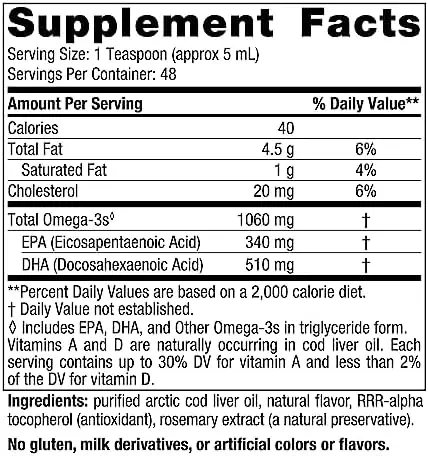 Our classic Arctic Cod Liver Oil has always been derived from 100% wild Arctic cod Skrei no other fish oils or synthetic additives are used, ever. Nordic Naturals fish oils are always processed in low heat, oxygen free environment to prevent the oxidation that causes the rancid taste and fishy burps of other products. And the naturally made strawberry flavor is so tasty its hard to believe youre having fish oilBy managing every step of the supply chain, we ensure the exceptional quality, safety, and sustainability of our products, from boat to bottle. This product is available unflavored, flavored and in soft gel form.Nordic Naturals is Committed to Delivering the Worlds Safest, Most Effective Nutrients Essential to Health. Nordic Naturals is the selling fish oil in the US with over 150 products in variety of flavors and doses to meet everyones nutritional needs. We strive to provide high quality products straight from the manufacturer to your home through sustainable methods and using nothing but natural ingredients. Nordic Naturals incorporates ethical and socially responsible practices with regard to the environment, corporate transparency, philanthropic partnerships, and education. Our continued innovation is proof that when values are aligned with action, great things can happenThese statements have not been evaluated by the Food and Drug Administration. This product is not intended to diagnose, treat, cure, or prevent any disease.