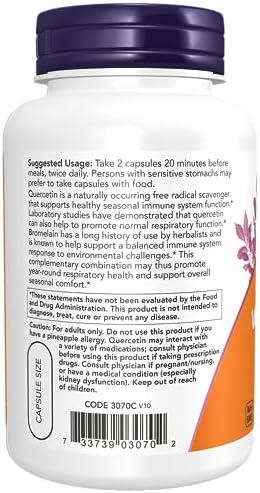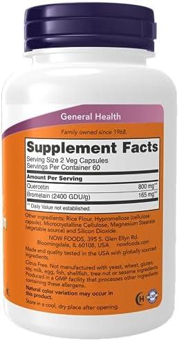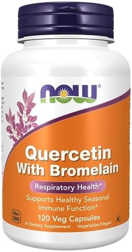 About this item BALANCED IMMUNE SYSTEM*: Quercetin is a naturally occurring free radical scavenger that supports healthy seasonal immune system function.* Laboratory studies have demonstrated that quercetin can also help to promote normal respiratory function.* WITH BROMELAIN: Bromelain has a long history of use by herbalists and is known to help support a balanced immune system response to environmental challenges.* CLASSIFICATIONS/CERTIFICATIONS: Kosher, Non-GMO, Soy Free, Vegan/Vegetarian, Nut Free, Made without Gluten, Dairy Free, Egg Free GMP Quality Assured: NPA A-rated GMP certification means that every aspect of the NOW manufacturing process has been examined, including our laboratory/testing methods (for stability, potency, and product formulation). Packaged in the USA by a family owned and operated company since 1968.