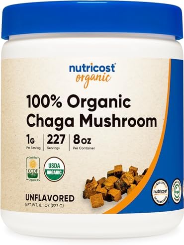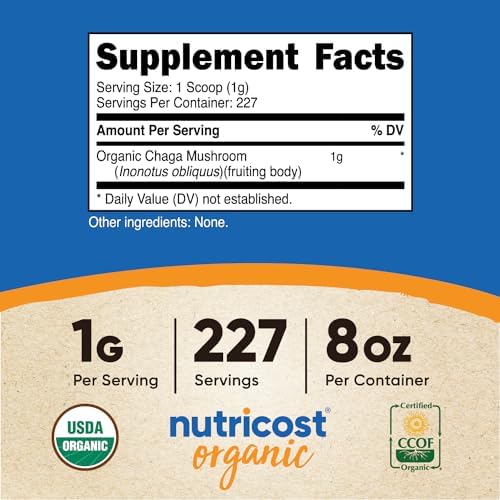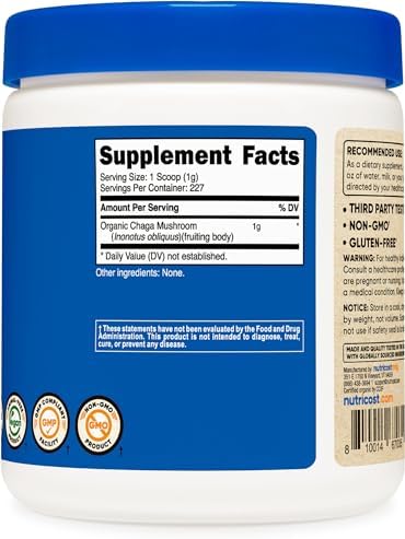 About this item Nutricost’s Organic Chaga Is Certified USDA Organic 1 Gram of Organic Chaga Per Serving (227 Servings) Gluten Free, Non-GMO, Pure Powder 8 oz of Chaga Per Bottle 3rd Party Tested, Made in a GMP Compliant, FDA Registered Facility