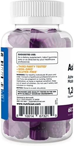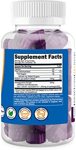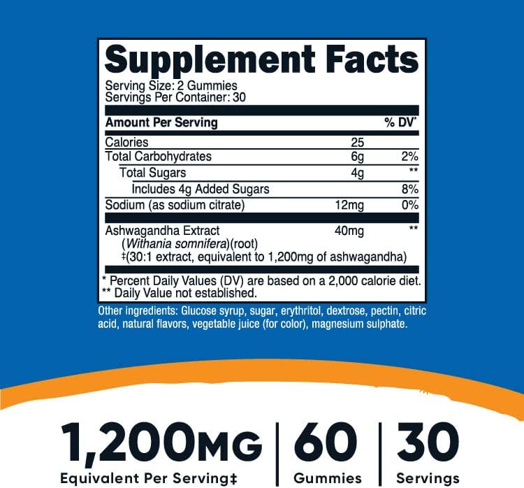 About this item 1200mg Equivalent of Ashwagandha Per Serving (From 40mg 30:1 Ashwagandha Extract) 60 Gummies, 30 Servings Tested by Independent, ISO-Accredited Laboratories Manufactured in a GMP Compliant, FDA Registered Facility Vegetarian, Non-GMO and Gluten Free