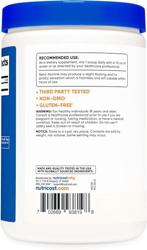 Nutricost’s Beta Alanine Powder is pure beta alanine, non-gmo and gluten free. Each bottle contains 500 grams of our high quality beta alanine powder and also has a convenient serving scoop. Nutricost, located and headquartered in the USA, only uses the best ingredients to ensure maximum quality and to help you feel your best! By keeping our recipes simple and clean, you get the best experience possible with Nutricost. All Nutricost supplements are manufactured in a GMP-compliant and FDA-registered facility, provide high-quality ingredients, and offer a variety of options for your health support.