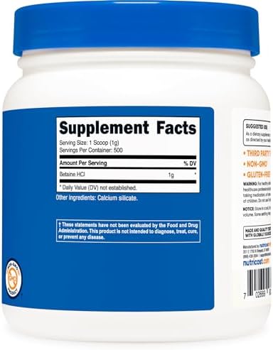 About this item 500G of Pure Betaine HCI Powder 1 Gram Per Scoop High Quality HCl Powder Serving Size: 1 Scoop (Included) Made in the USA