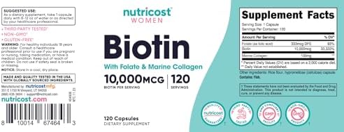 Nutricost Biotin for Women 10,000mcg 120 Capsules – with Folate & Collagen, Gluten Free & Non-GMO