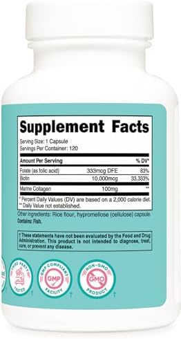 About this item 10,000 MCG of Biotin (Vitamin B7) – 120 Capsules 333mcg of Folate Per Capsule 100mg of Marine Collagen Per Capsule Non-GMO, Gluten Free, and 3rd Party Tested Made in a GMP Compliant, FDA Registered Facility
