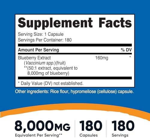 About this item 8,000mg Blueberry (From 160mg 50:1 Extract) in Every Serving 180 Vegetarian Capsules, 180 Servings per bottle Easy To Swallow Capsules, Potent Serving Non-GMO, Gluten Free, 3rd Party Tested Made in a GMP Compliant, FDA Registered Facility