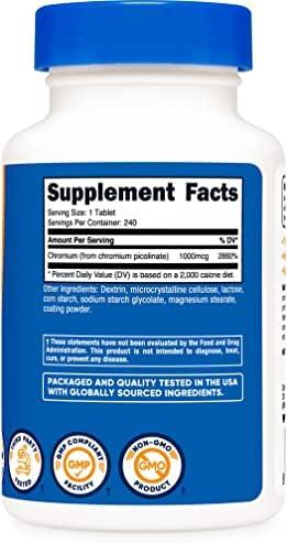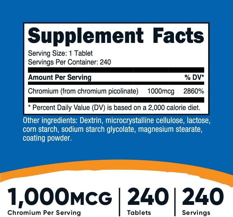 Nutricost Chromium Picolinate tablets contain 1,000mcg of chromium in each tablet. Each bottle contains 240 tablets. They are small, easy-to-swallow tablets. This product is non-gmo, gluten free, and made in a GMP compliant, FDA registered facility.