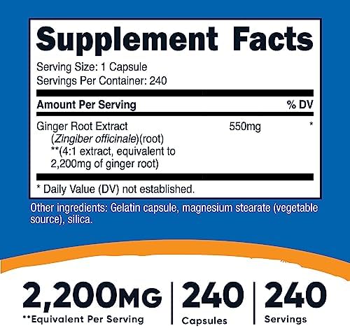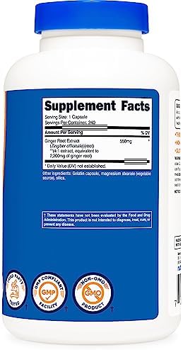 About this item Ginger Helps Ease Stomach Comfort Stimulates Digestion 240 Servings Per Bottle This Product Does Not Contain Yeast, Has No Artificial Color, No Flavor or Sweetener, No Preservatives, No Sugar, No Starch, No Corn, No Soy, No Egg, No Lactose, No Gluten, No Wheat, No Fish, No Sodium Non-GMO, Gluten Free, Made in the USA
