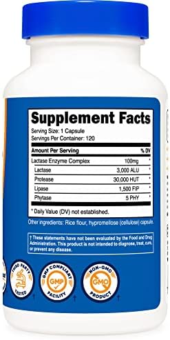 About this item 120 Vegetarian Capsules of Lactase Enzyme Complex Per Bottle Easy To Swallow Serving Size: Just 1 3,000ALU Capsule Non-GMO and Gluten Free Manufactured In a GMP Compliant, FDA Registered Facility