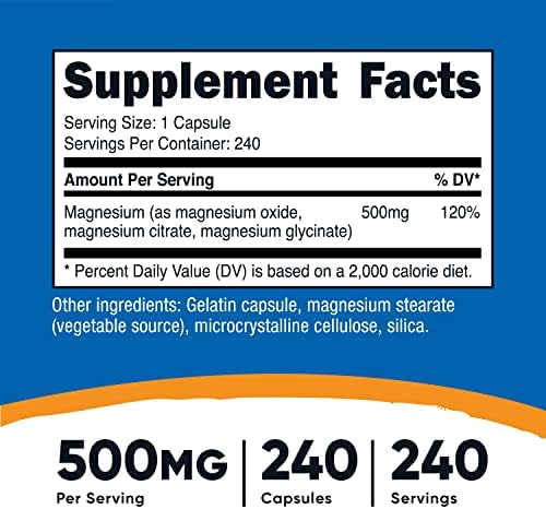 About this item 500mg of Magnesium Per Serving from Magnesium Oxide, Magnesium Citrate, and Magnesium Glycinate 240 Capsules for 240 Servings Of Our Triple Mangesium Complex 8 Month Supply (If Taken As Recommended) Gluten Free and Non-GMO Made In A GMP Compliant, FDA Registered Facility