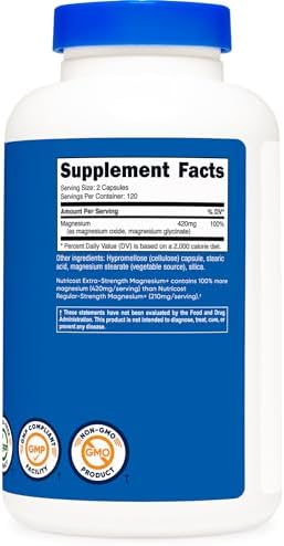 Nutricost Magnesium Glycinate contains 420 milligrams of magnesium (from magnesium glycinate) in every serving. 240 capsules for 120 Servings per bottle. Nutricost, located and headquartered in the USA, only uses the best ingredients for maximum quality and to help you feel your best! By keeping our supplement recipes simple and clean, you get the best experience possible with Nutricost. Our supplements are manufactured in a GMP-compliant and FDA-registered facility; and each batch of every product is tested by independent, ISO-accredited laboratories.