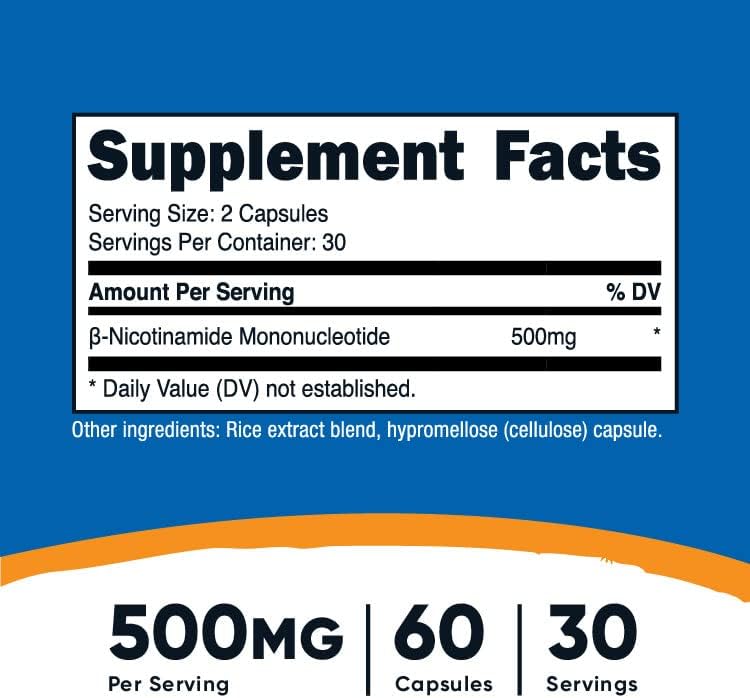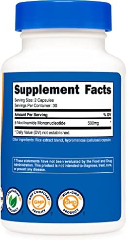 About this item 500mg of NMN (Nicotinamide Mononucleotide) Per Serving 60 Capsules for 30 Servings Per Bottle – 2 Capsules Per Serving 1 Month Supply If Taken According to Recommended Use Non-GMO, Gluten Free, And Vegetarian Friendly 3rd Party d by ISO-accredited Laboratories