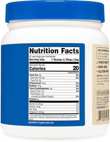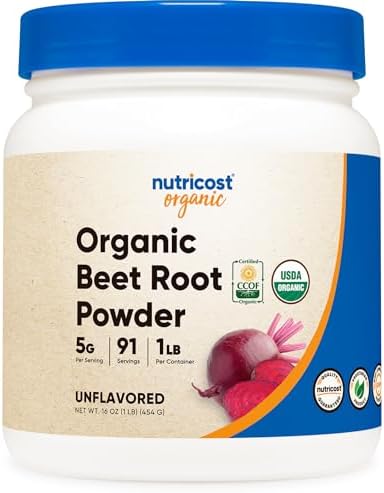 Nutricost’s beet root powder is USDA certified organic and contains 1 pound of high quality beet root powder. It is vegetarian friendly, non-gmo, gluten free, soy free, and made in a GMP compliant, FDA registered facility. Please be aware that beet root can easily stain.