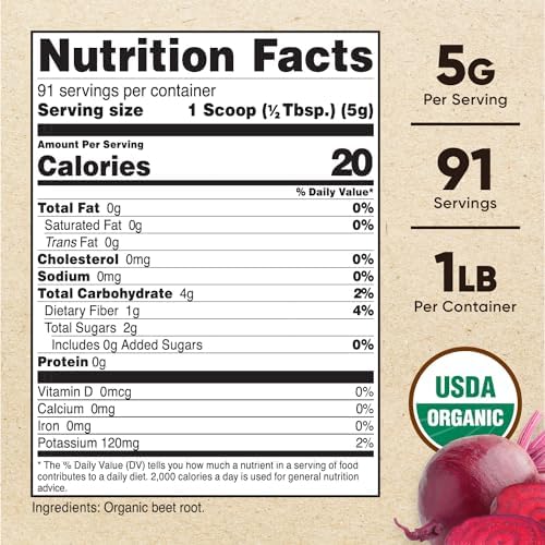 About this item Certified USDA Organic Beet Root Juice Powder 1 Pound of Beet Root Powder Per Bottle Convenient Serving Scoop Included (~1 rounded tsp) Organic, Vegetarian, Gluten Free, Non-GMO, Soy Free Made in a GMP Compliant, FDA Registered Facility