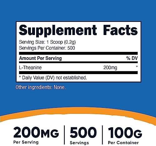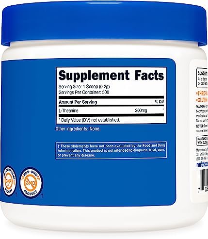 About this item 200mg of L-Theanine Per Serving (500 Servings) Gluten Free and Non-GMO Help improve sleep quality by promoting a more relaxed state. Reduction in stress 100 Grams of L-Theanine Per Bottle