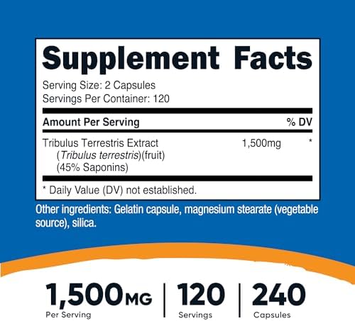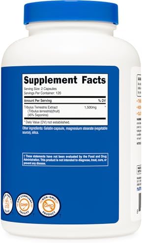 About this item 240 Capsule of Tribulus Terrestris Per Bottle, 120 Servings Made With High Quality Tribulus Terrestris with 40% Saponins 1500mg of Tribulus Terrestris Per Serving Non-GMO, Soy Free, and Gluten Free Manufactured In a GMP Compliant, FDA Registered Facility