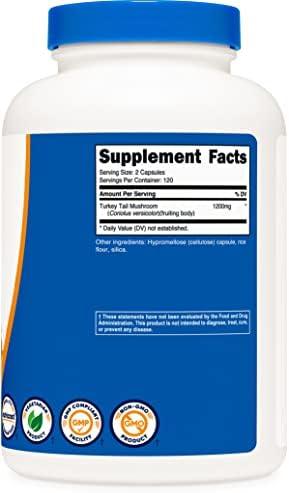 About this item 1,200mg Turkey Tail Mushrooms Per Serving, 600mg Per Capsule 240 Vegetarian Capsules Per Bottle for 120 Servings 4 Month Supply (If Taken As Directed) Vegetarian, Gluten Free, Soy Free, and Non-GMO Made in a GMP Compliant, FDA Registered Facility