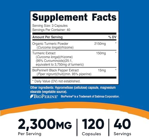 Turmeric 2300MG Per Capsule & 120 Easy To Swallow Capsules Per Bottle 95% Curcuminoids Turmeric With BioPerine For Improved Absorption High Quality, Non-GMO, Gluten-Free, Potent Turmeric Curcumin Pills Made in a GMP Compliant, FDA Registered Facility Turmeric has been used… Turmeric 2300MG Per Capsule & 120 Easy To Swallow Capsules Per Bottle 95% Curcuminoids Turmeric With BioPerine For Improved Absorption High Quality, Non-GMO, Gluten-Free, Potent Turmeric Curcumin Pills Made in a GMP Compliant, FDA Registered Facility Turmeric has been used in Asia for thousands of years. Nutricost Turmeric contains 2300mg in each capsule and 120 capsules in each bottle.