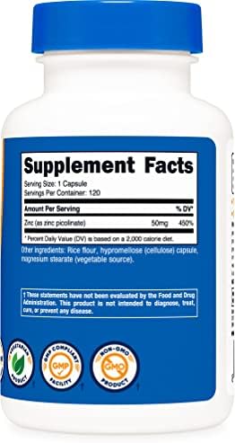 About this item 120 Vegetarian Caps Per Bottle 50 mg of Zinc (from Zinc Picolinate) Per Serving 120 Servings of Zinc Picolinate Per Bottle Non-GMO, Gluten Free, Vegetarian Manufactured In a GMP Compliant, FDA Registered Facility