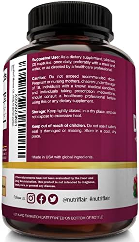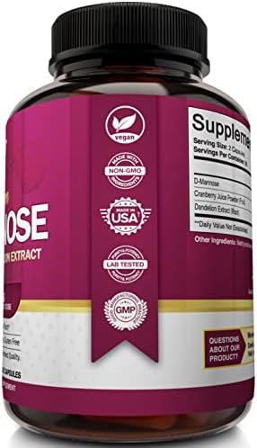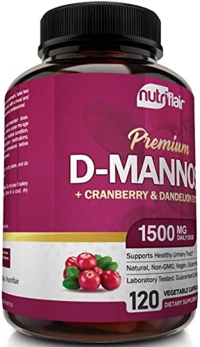 About this item ✔️ Supports Immune & Urinary Tract Systems. NutriFlair D-Mannose Supplement, 120 Vegan Capsules Delivers 1200 mg of a combination of DMannose, Cranberry, Dandelion Extract, per Serving of 2 Capsules. Best supplement to get rid of Urinary Tract Issues and UTI*: Flush Impurities, Detox Body. D Mannose supports healthy flora, does not affect “friendly” body organisms, and is ideal for Women and Men alike. ✔️ Ultra Potent Cleanser: The NutriFlair D Mannose Pills features powerful ingredients such as D-Mannose, Cranberry Juice Powder (from fruit), and Dandelion Extract, proven to promote bladder wellness. D-Mannose, found in berries, helps to flush out impurities from your urinary tract. Cranberry naturally contains Malic, Citric and Quinic Acids, all of which help acidify the urine and cleanse the bladder walls. ✔️ Flush Impurities: Helps promote urinary function with proper pH balance. What’s better than cranberry pills for maintaining healthy urinary tract and l health: A combination of D Mannose, Cranberry, and Dandelion Extract. You can have the confidence that every capsule has the strength and potency that you are looking for in a product. ✔️ Purity & Quality You Can Trust: All NutriFlair Products are manufactured in the USA, in a duly Registered, Approved, and Inspected State-of-the-art Facility, with Strict Adherence to Good Manufacturing Practices (GMP). They are also 3rd Party Tested for Quality, Purity, and Potency. This includes all our Best Quality capsules, tablets, pills, supplements, vitamins, multivitamins, vegan and natural foods, powders, oils, and extracts for men, women, children, and seniors. ✔️ Trusted Brand: Satisfaction Assured. If our non-GMO DMannose with Cranberry and Dandelion Capsules do not bring noticeable value to you and you don’t absolutely love them, your purchase is on us. no questions asked. Our world-class customer service wants you to be satisfied with your purchase. Absolutely no risk. The bottle comes with the NutriFlair Satisfaction Pledge for 30 days. Have this all-mighty natural urinary tract health formula by your side and get rid of the undesired.
