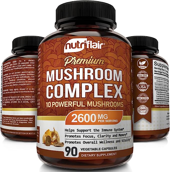 Fuel your body and mind with NutriFlair’s powerful 10-in-1 Organic Mushroom Complex. Packed with Reishi, Lion’s Mane, Cordyceps, Chaga, Turkey Tail, Maitake, Shiitake, and more, this premium blend is designed to support brain function, immune defense, energy, and focus – all in one easy-to-take capsule.