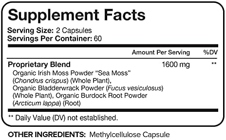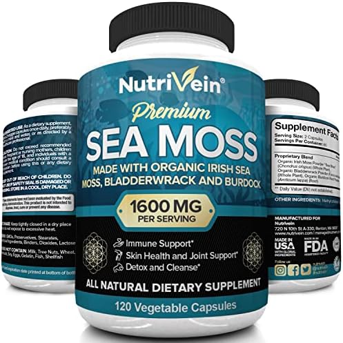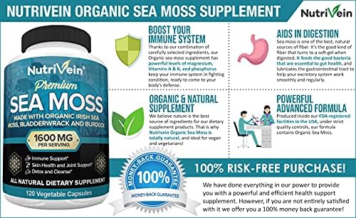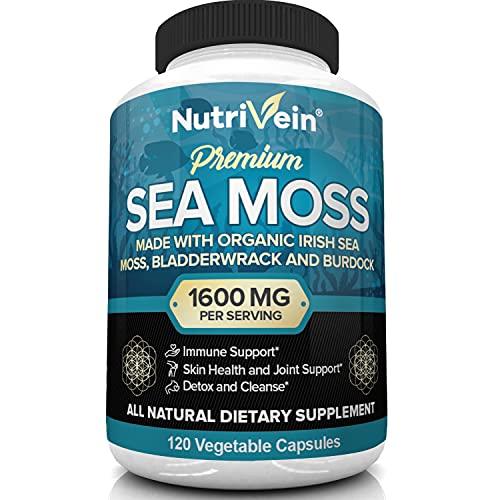 Nutrivein Organic Sea Moss 1600mg Plus Bladderwrack & Burdock – 120 Capsules – Prebiotic Super Food Boosts The Immune System & Digestive Health – Thyroid, Healthy Skin, Keto Detox, Gut, Joint Support
