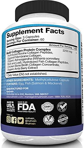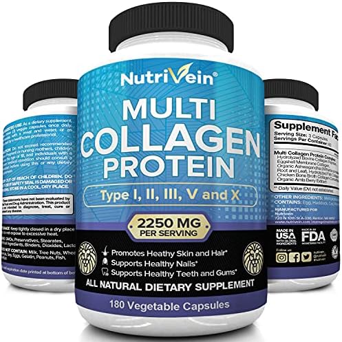 Nutrivein Type I, II, Iii, V, X – Anti-Aging Multi Collagen Pills for Woman and Men (2250mg)- 180 Capsules