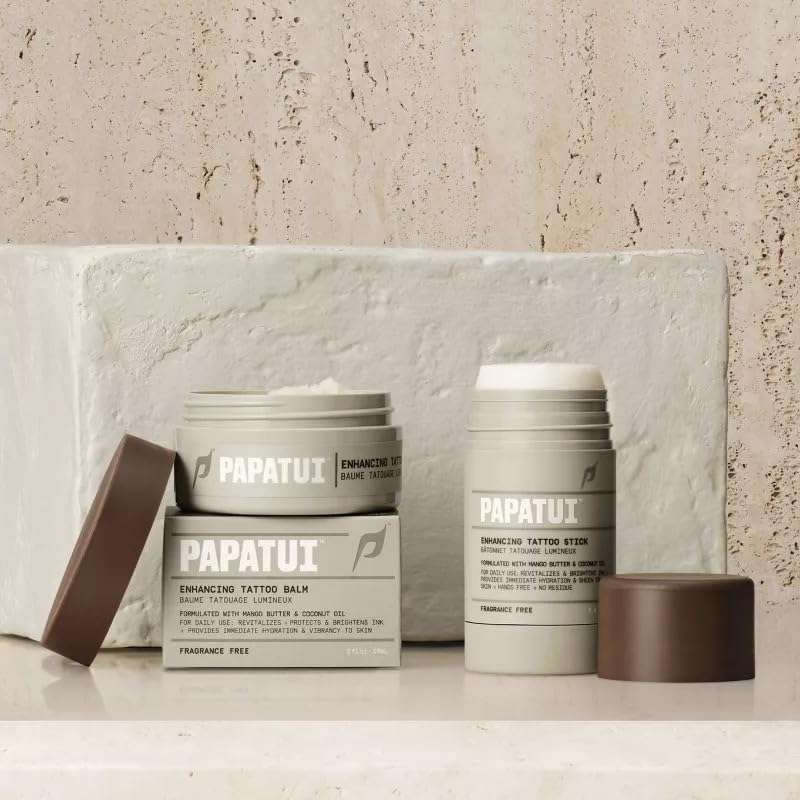 - New PAPATUI Enhancing Tattoo Balm is unscented. Made with key ingredients like Mango Butter & Coconut Oil. Revitalizes, Protects & brightens ink, Provides immediate hydration & vibrancy to skin; Hands free & no residue. 97% of Men tested said the formula was effortless to apply. 95% of Men tested said the formula delivers full tattoo coverage. 4 out of 5 Men tested said their tattoo appears more vibrant and the color appears brighter. Paraben Free, Phthalate Free, Cruelty Free, Vegan & Fragrance Free.