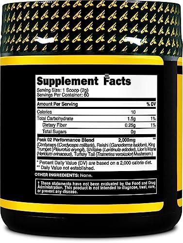 About this item Peak O2 is a natural blend of six 100% USDA organic-certified Ayurvedic mushroom strains grown and harvested in the USA. 120 grams of Peak O2 Performance Blend and 60 servings per container. Non-GMO, No Additives, No Preservatives, No Artificial Colors, No Flavors, No Soy, No Fillers and No Gluten. Lab-tested for potency and purity. Primaforce uses only the highest quality ingredients that are backed by the latest research and development to enhance your workout. Made in a GMP-Compliant, FDA Registered Facility.