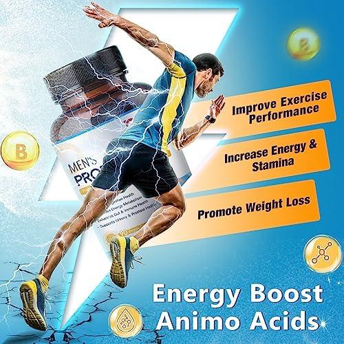About this item Gut Health Support: Combine the power of 100 Billion CFUs probiotics from 20 strains, prebiotics, enzyme, amino acids, saw palmetto and vitamin B complex to create an all-in-one gut health solution that’s easy and effective. High-potency probiotic offer 90 capsules in a shelf-stable bottle and 50 Billion CFUs in each capsule, you can adjust the dosage if you need, so the serving size is 45 days and even more. Your well-being begins from the gut, please arm it with our cost-effective probiotics. Complete Digestive Health & Weight Manage: Digestive enzymes help break down food to turn into energy, boost nutrient absorption, and relieve gas & bloating. Probiotics help replenish the gut flora aid in digestion balance, reduce constipation & diarrhea. Prebiotic fibers produce short-chain fatty acids and promote probiotic growth. Taking digestive enzymes with probiotics and prebiotics together make your digestion in top shape, and more effective for weight loss. Prostate & Urinary Tract Health Support: Formulated with SAW PALMETTO and Vitamin K2 to support healthy prostate function and balance hormone levels. In addition, we use CRANBERRY and Vitamin C to reduce adhere of E. coli and promote urinary tract (UT) health. A superior formulation restores proper balance, reduces the frequent urge to urinate, no pain or burning and dribbling of urine. No sugar, calories, or preservatives that are safe men’s supplements to set you up for long-term wellness. Amino Energy & Immune Support: L-Taurine and amino acids help you stay alert and energized throughout the day. Vitamin B helps produce energy and enhance mood, fight against free radicals, and improve the body’s immune response to reduce infection. Probiotic also support the gut-brain connection and enhance cognition which is suitable for men over 50. This unique formula is perfect for any time of the day, from helping you get energized in the day to get a good sleep in the evening. Our Strength: Featured enteric-coated capsules which have an acid-resistant coating that won’t irritate the stomach lining. Delay-released properties ensure strains are released in the intestine for a deep colon cleanse and detox. All ingredients are natural, dairy-free and Non-GMO. No refrigeration need, just slip the bottle into your bag if you’re out. We guarantee our probiotics potency until the expiration date, and a full refund policy if you are not satisfied with it.