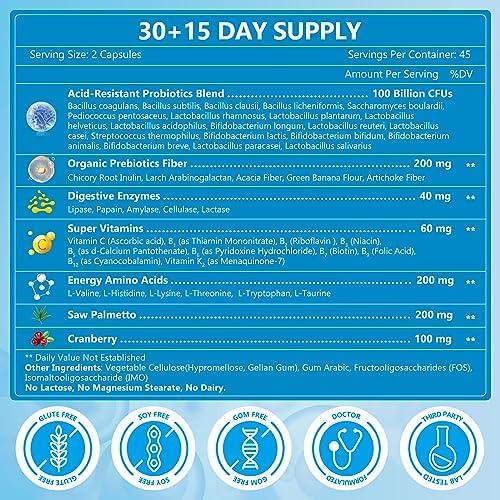 • Gut Health Support: Combine the power of 100 Billion CFUs probiotics from 20 strains, prebiotics, enzyme, amino acids, saw palmetto and vitamin B complex to create an all-in-one gut health solution that’s easy and effective. High-potency probiotic offer 90 capsules in a shelf-stable bottle and 50 Billion CFUs in each capsule, you can adjust the dosage if you need, so the serving size is 45 days and even more. Your well-being begins from the gut, please arm it with our cost-effective probiotics.