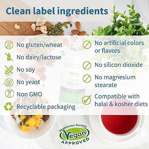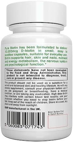 About this item PURE & CLEAN vegan, non-GMO, hypoallergenic ingredients with no unpleasant additives (silicon dioxide, magnesium stearate or titanium dioxide). Lab verified, GMP manufactured in the UK MAXIMUM POTENCY & EFFECTIVE DOSE – Pure Biotin is expertly formulated to raise biotin levels with an effective daily dose of 10,000 mcg D-Biotin (vitamin B7)* SKIN, HAIR & NAILS: biotin supplements support the skin health of men and women, as well as keratin production – a protein that promotes strong hair and nails* MULTIPLE HEALTH BENEFITS: 10,000mcg biotin supports energy and metabolism, mood health and the nervous system* 180 SERVINGS: each bottle delivers 180 capsules, a convenient 180-day supply at the recommended daily dose of 1 capsule